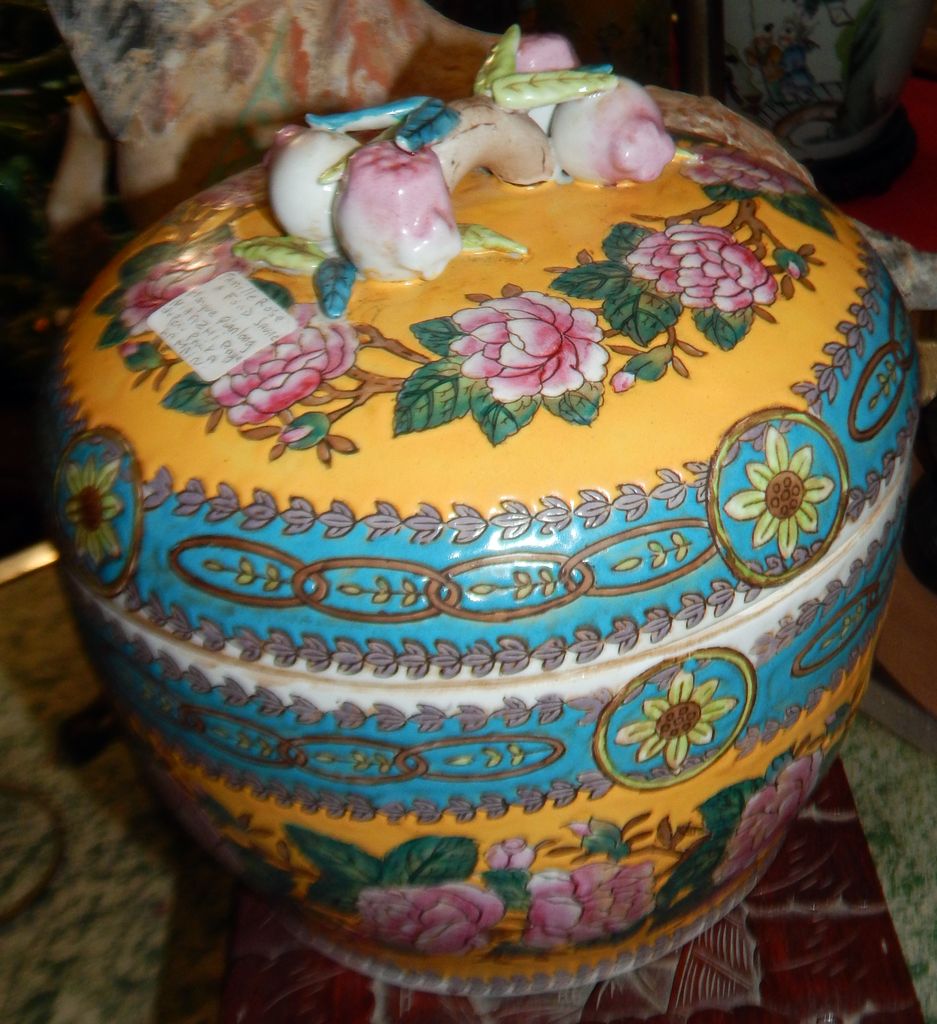 | Potiche asiatique famille rose à fond jaune marque QIANLONG |